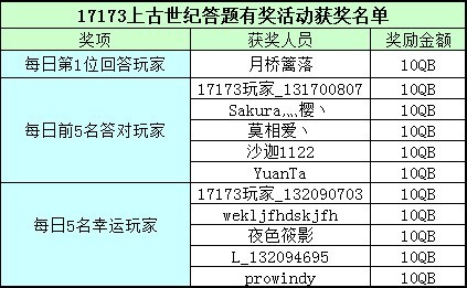 17173上古世纪有奖问答活动赢Q币活动1月14日获奖(参加岁末狂欢活动)