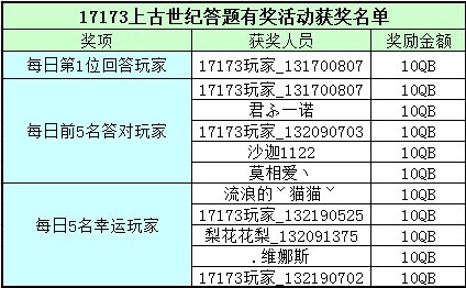 17173上古世纪有奖问答活动赢Q币活动1月15日获奖(参加岁末狂欢活动)