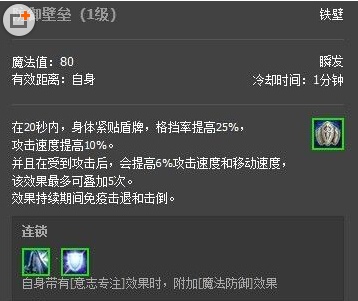 铁壁天赋的一个核心技能不能击倒以及增加格挡率 玩的好的龙刃可以靠这个技能1V3不是梦!近战类玩家一定要注意的一个buff 一般类似龙刃刀锋之类的职业是把这个技能和狂暴连着开打出一波爆发带走人的