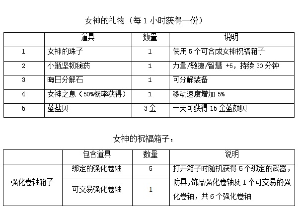 1、活动期间,玩家每累计在线1小时,可领取一份女神送出的礼物;