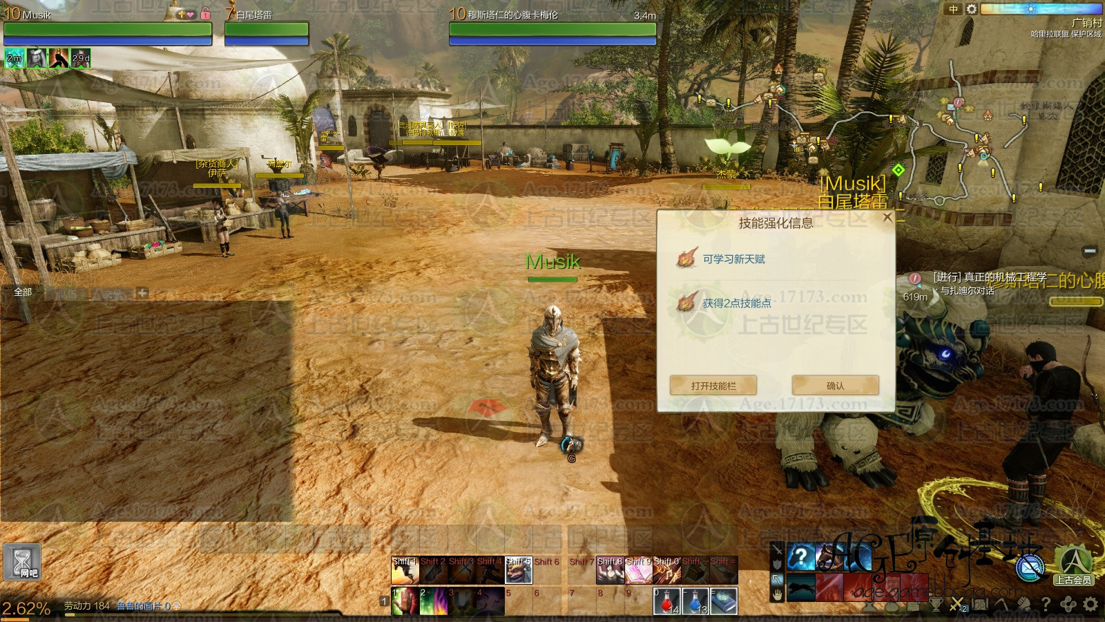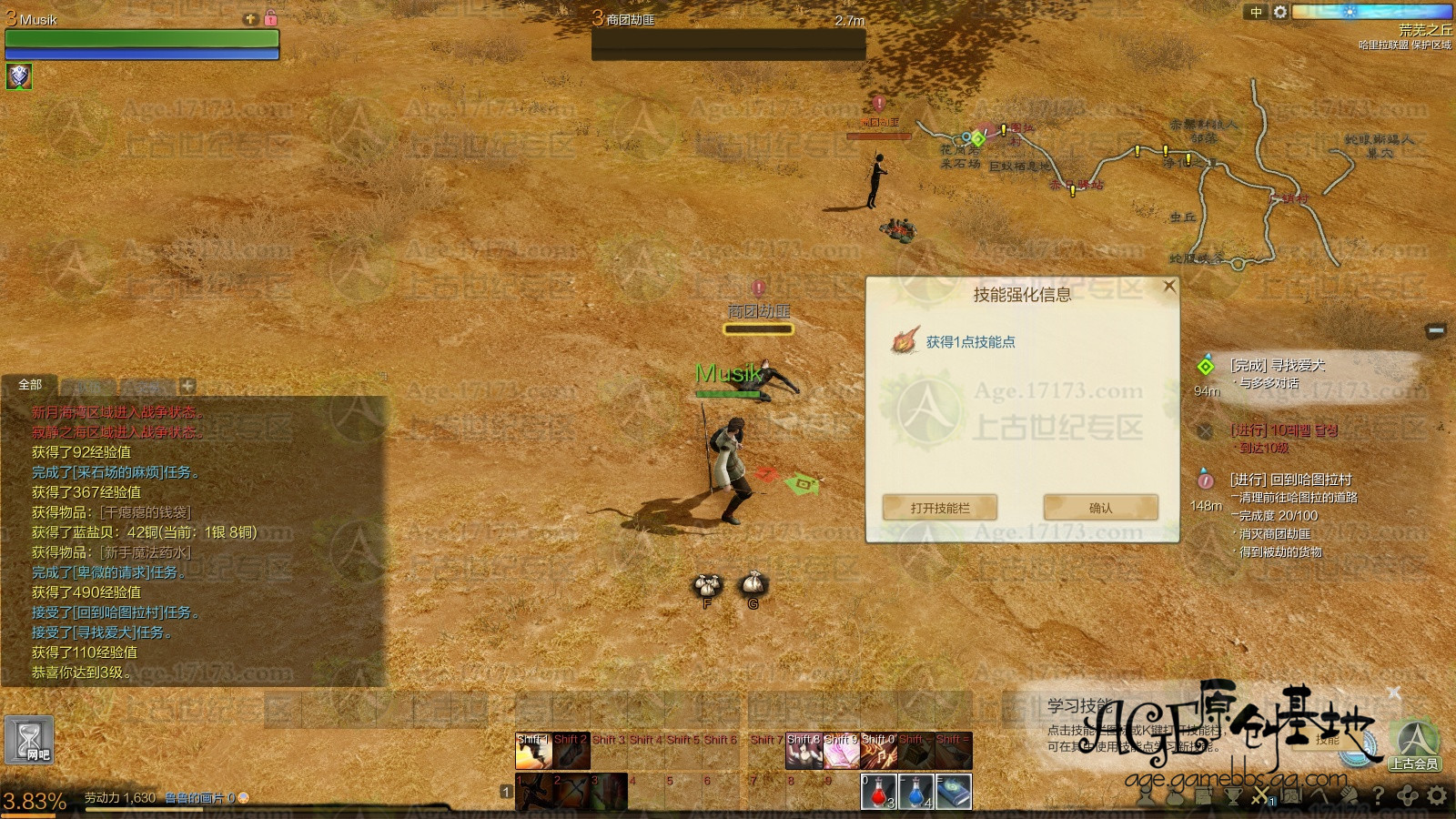 玩家到达三级出现一个技能强化信息的窗口,获得一点技能点,打开技能栏可以看到